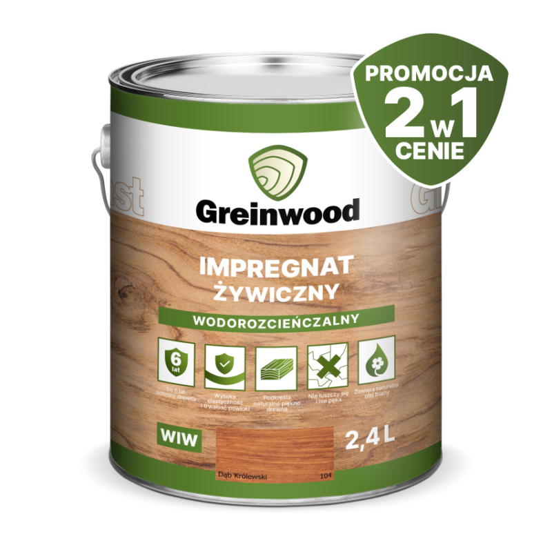 Impregnat na bazie innowacyjnej dyspersji alkidowej, wykonanej w technologii wodnej, dodatków modyfikujących i kolorantów. Baza alkidowa zapewnia wyjątkowo głęboką penetrację malowanego drewna, bardzo wyraźnie podkreśla naturalny wzór słojów drewna, tworząc piękne efekty dekoracyjne, a na drewnie heblowanym tworzy efekt jedwabiście gładkiej powierzchni. Równocześnie powłoka nie pęka, nie łuszczy się, jest odporna na wilgoć i wnikanie wody, a tym samym zapewnia długoletnią ochronę przed warunkami atmosferycznymi. Impregnat Greinplast WIW dostępny jest w 16 kolorach według palety barw Producenta. W systemie z BIOAKTYWNYM IMPREGNATEM GRUNTUJĄCYM DO DREWNA GREINPLAST WB zapewnia wysoką ochronę przed oddziaływaniem biologicznych czynników niszczących drewno, zapewniając mu do 6 lat ochrony.