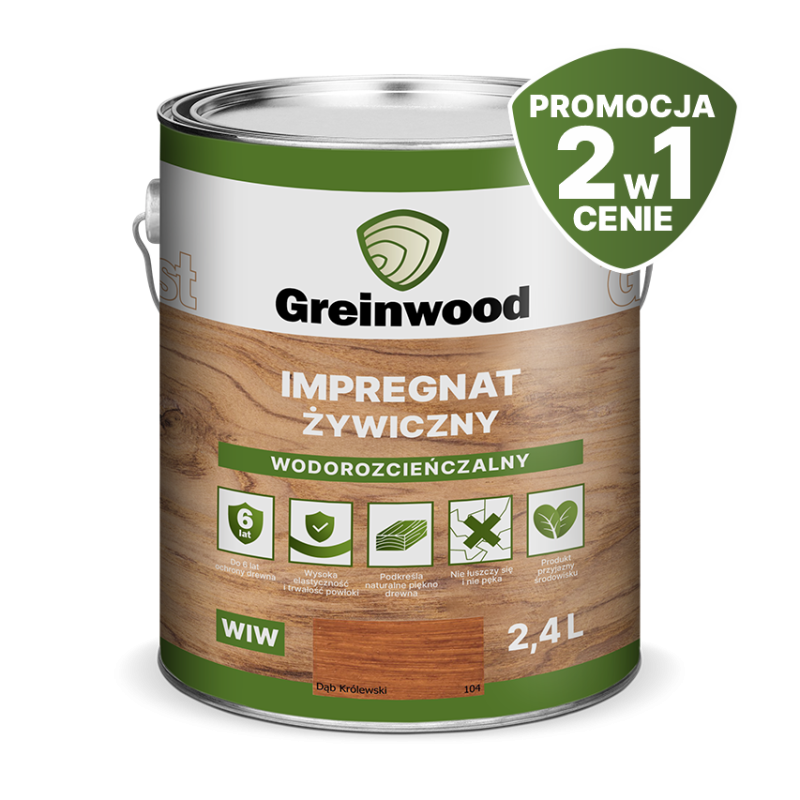 Impregnat na bazie innowacyjnej dyspersji alkidowej, wykonanej w technologii wodnej, dodatków modyfikujących i kolorantów. Baza alkidowa zapewnia wyjątkowo głęboką penetrację malowanego drewna, bardzo wyraźnie podkreśla naturalny wzór słojów drewna, tworząc piękne efekty dekoracyjne, a na drewnie heblowanym tworzy efekt jedwabiście gładkiej powierzchni. Równocześnie powłoka nie pęka, nie łuszczy się, jest odporna na wilgoć i wnikanie wody, a tym samym zapewnia długoletnią ochronę przed warunkami atmosferycznymi. Impregnat Greinplast WIW dostępny jest w 16 kolorach według palety barw Producenta. W systemie z BIOAKTYWNYM IMPREGNATEM GRUNTUJĄCYM DO DREWNA GREINPLAST WB zapewnia wysoką ochronę przed oddziaływaniem biologicznych czynników niszczących drewno, zapewniając mu do 6 lat ochrony.