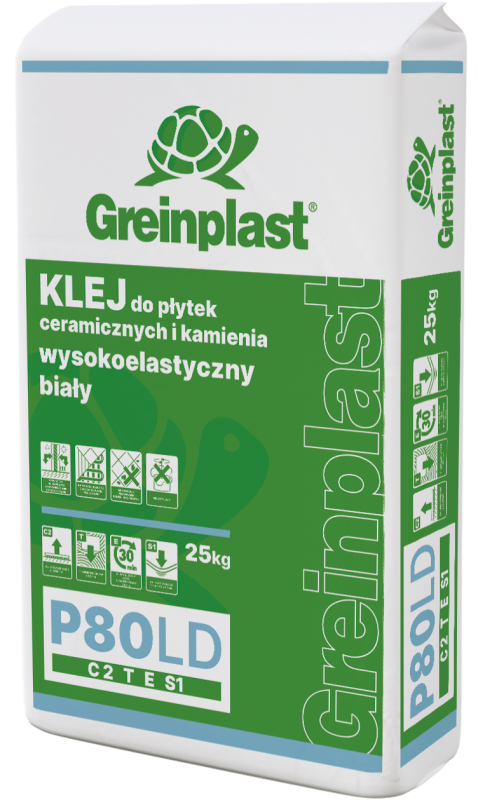 Klej wysokolestyczny Greinplast P80LD o wysokiej przyczepności do podłoża. Umożliwia przyklejanie płytek o zmniejszonej nasiąkliwości, tak zwanych płytek gresowych. Jest mrozo i wodoodporny. Produkowany w technologii ograniczającej pylenie GREINPLAST „Low Dust”.  Typ: C2TE S1.