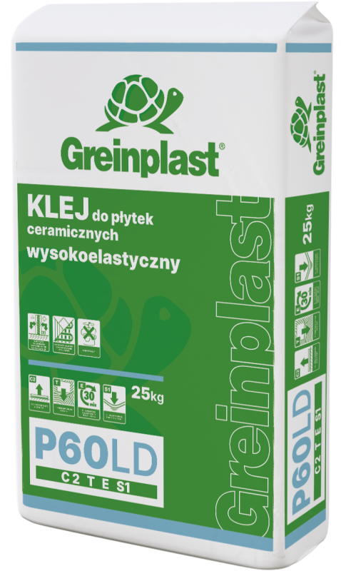 Greinplast P60LD to wyskokoelastyczny klej do przyklejania płytek ceramicznych (także wielkoformatowych) wewnątrz i na zewnątrz budynków na odkształcalnych powierzchniach poziomych, pionowych o obniżonym spływie, wydłużonym czasie otwartym pracy, podwyższonej przyczepności oraz wysokiej elastyczności. Produkowany w specjalnej w technologii ograniczającej pylenie Greinplast „Low Dust”. Jest mrozo i wodoodporny można go stosować w pomieszczeniach suchych i czasowo wilgotnych. Typ: C2TES1.