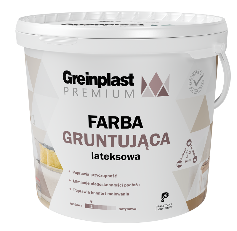Farba gruntująca lateksowa jest przeznaczona do stosowania wewnątrz pomieszczeń. Służy do ręcznego lub natryskowego nakładania na stabilnych podłożach. Produkt dostępny w kolorze białym. Wewnątrz budynków, do wykonywania warstwy pierwotnej stabilizującej podłoże przed malowaniem farbami wewnętrznymi Greinplast. Farba może być stosowana na podłożach betonowych, tynkach cementowych i cementowo-wapiennych, (po 28 dniach od ich wykonania), tynkach gipsowych, płytach G-K, tynkach cienkowarstwowych itp.