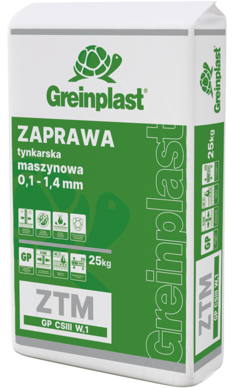 Służy do maszynowego (z wykorzystaniem agregatów tynkarskich) wykonywania tynków cementowo-wapiennych w kategoriach powierzchni od I do III wewnątrz i na zewnątrz budynków. Wyrób klasyfikowany jako zaprawa tynkarska ogólnego stosowania (typ GP), o wytrzymałości na ściskanie kategorii CS III (3,5-7,5 N/mm2) i kategorii absorpcji wody Wc1. Może być stosowany po wcześniejszym wykonaniu warstwy podkładowej (tzw. obrzutki) z zaprawy GREINPLAST ZTP.